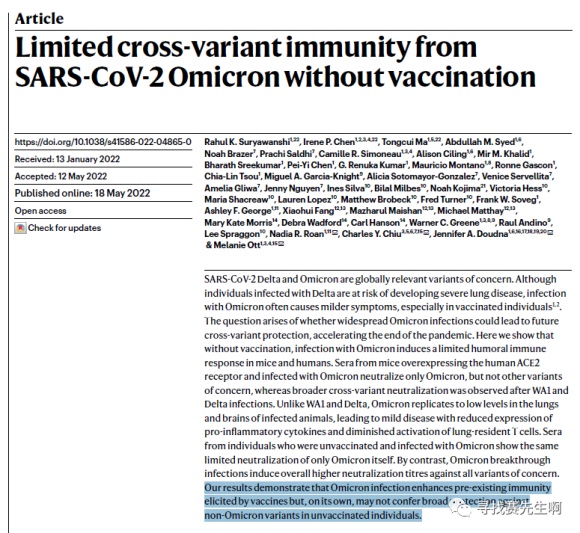 标注部分翻译:Omicron感染增强了疫苗引发的预先存在的免疫力,但就其本身而言,可能无法在未接种疫苗的个体中提供针对非Omicron变异株的广泛保护。