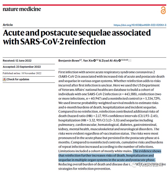 标注部分翻译:证据表明,重复感染进一步增加了急性期和急性期后死亡、住院和多器官系统后遗症的风险。