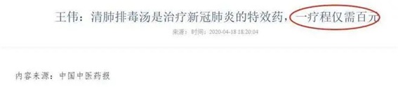 2020年,王伟院士宣布清肺排毒汤是治疗新冠肺炎的特效药,一个疗程仅需百元。