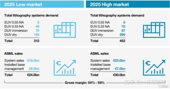 从图中我们可以看出,asml2025年市场预估从图中我们可以看出,asml2025年的市场目标,低标是70台浸没式duv,190台干式duv。而高标是87台浸没式duv,290台干式duv。其中两款euv的销量没啥变。