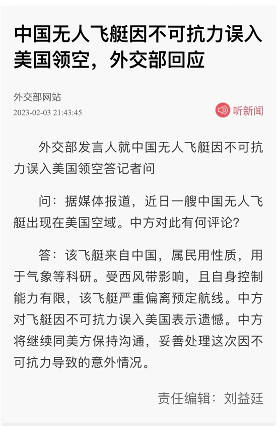 我个人认为,我们中国官方说的气球是“不可抗力因素”飘到美国去的这种说法就是事实。