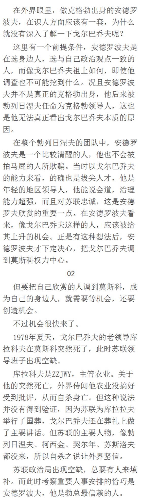 其实有人会说,谁也没有前眼,不可能那时就能看到戈尔巴乔夫的骨头里。但苏联是有一套选人用人机制,只是到了勃列日涅夫时代被破坏了,没人坚持,转而成了摆设,选人用人就是领导认为可以,直接选拔使用,什么样的程序都略过了,这必然造成很多隐患。