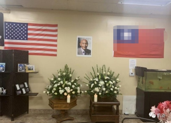 “灵堂”很草率,不伦不类,草率到连遗像都是用A3纸打印。主题仍然是反华:一面星条旗(表示他在美国),还故意不用五星红旗来表示他是中国人。