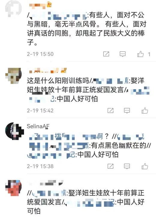 “有些人,面对不公与黑暗,毫无半点风骨。有些人,面对讲真话的同胞,却甩起了民族大义的棒子。”