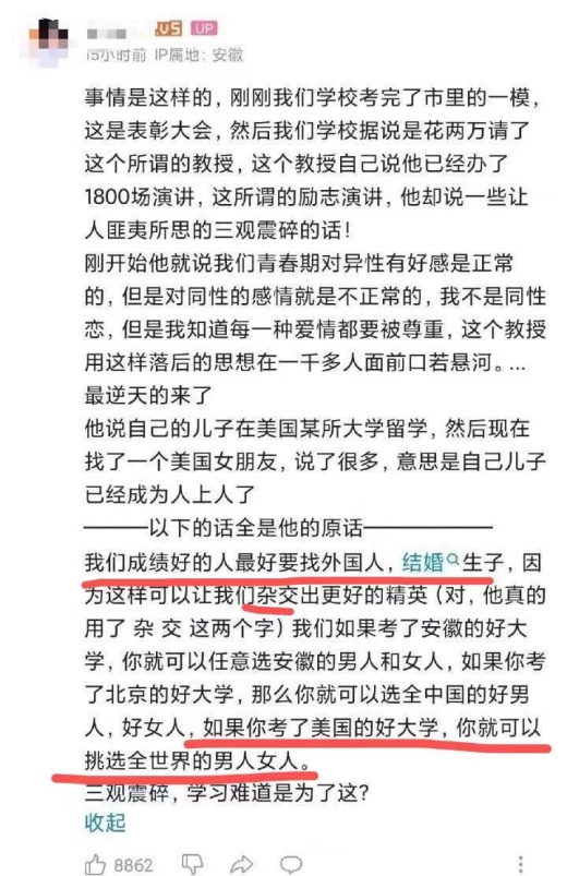 他语出惊人:“成绩好的要找外国人结婚生子”,“这样能让我们杂交出更好的精英”,“读书就是为了钱,金钱就是一切”。