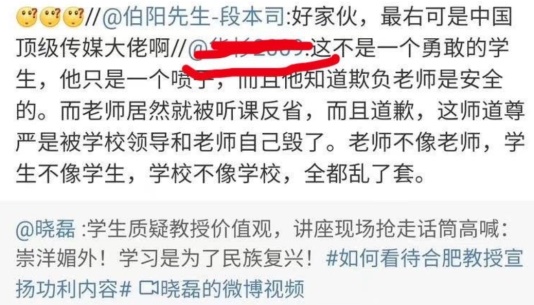 他们再也不谈言论自由、思想自由,反而开始密集发声论证这个孩子“不懂礼仪”、“不知师道尊严”、“鲁莽”、“无知”、“暴徒”、“义和团”、“红卫兵”......帽子一顶接一顶。