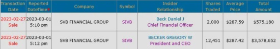 有消息传出,在该行倒闭前两周,硅谷银行(Silicon Valley Bank)首席执行官CEO格雷格·贝克尔在2月27日以每股287.42美元的均价出售了12451股。CFO贝克尔以每股106.04美元的股票期权购买了同样数量的股票。