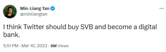 他在推特发文:“我认为推特应该收购美国硅谷银行,并将其变为‘数字银行’。”