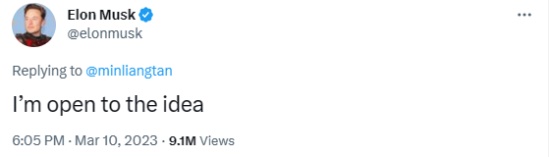 不到20分钟,马斯克就留言回复称,“我对这个想法持开放态度”。