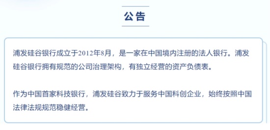 浦发硅谷银行发布公告称,“浦发硅谷银行成立于2012年8月,是一家在中国境内注册的法人银行。浦发硅谷银行拥有规范的公司治理架构,有独立经营的资产负债表。作为中国首家科技银行,浦发硅谷致力于服务中国科创企业,始终按照中国法律法规规范稳健经营。”