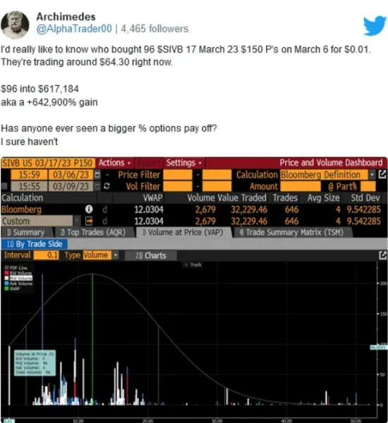不仅如此,更令人发指的是,在硅谷银行爆雷的 3 天前,居然有人在3月6日以一美分的价格买入大量3月17日到期的SIVB看跌期权(PUT),96美元的投资暴涨6430倍!