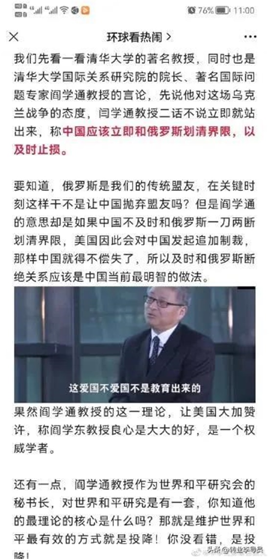 3.公方彬同志一再认为俄罗斯将战败解体,并倒向西方,并且会对曾经支持过他的国家抛弃迁怒!这样的结论也真是莫名其妙,被谁洗脑了?言下之意就是中国不能支持俄罗斯,必须立刻与俄罗斯划清界限。这与清华大学那个阎学通让中国立刻与俄罗斯断绝关系并且立刻向西方投降不是一个汉奸论断吗?