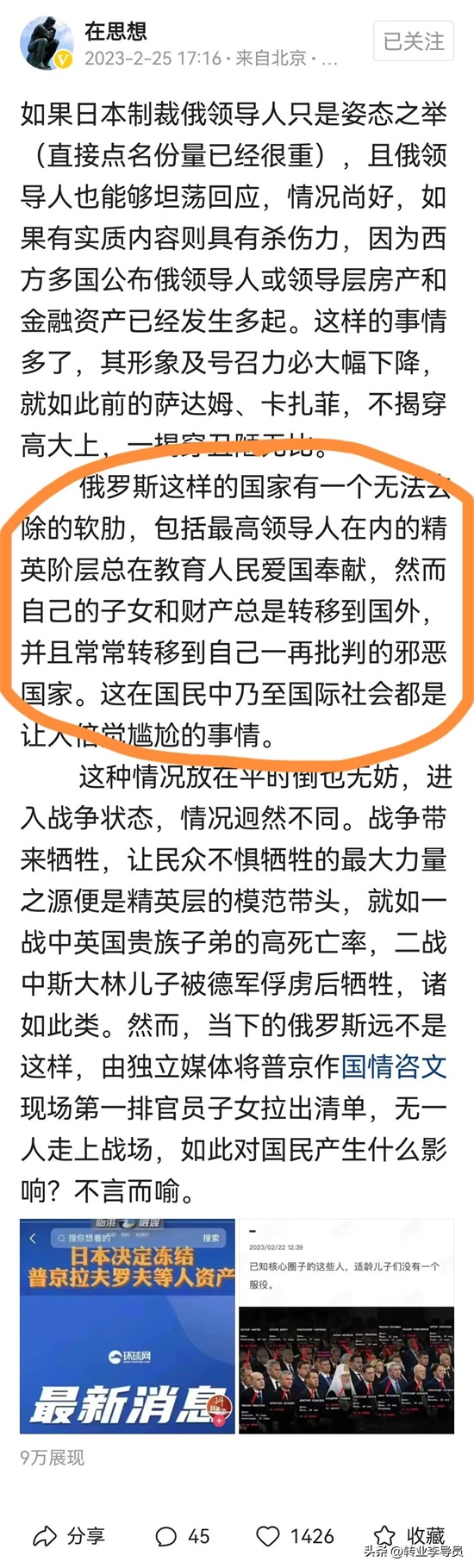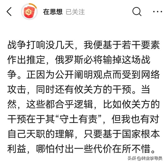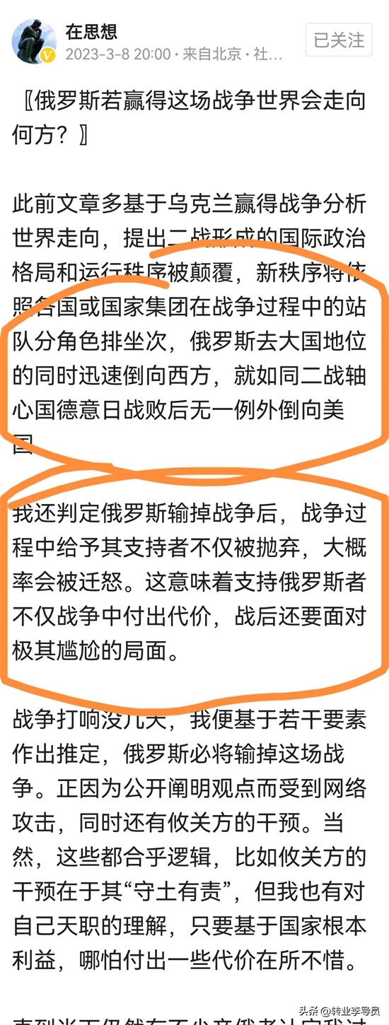 4.纵观公方彬同志关于俄乌冲突的文章,里面充斥着“俄罗斯必输”“乌克兰和北约必赢”“中国必须立刻停止支持俄罗斯,否则后果很严重”“俄罗斯是邪恶的”“乌克兰是正义的”这样的论断!我只能说这不叫独立思考,而是跟随西方那一套人云亦云,这种言论很危险!