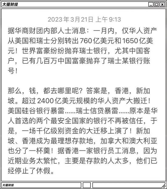 前两天有个截屏疯传,说是华人手里大约760亿美国存款和1600亿瑞士存款正在疯狂转移到香港。