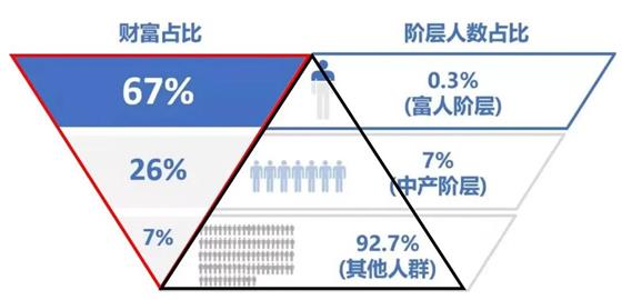 占总人口0.33%的富人拥有67%的财富,而占到总人口92.77%的人群拥有7%的财富,只相当于富人的一个零头。