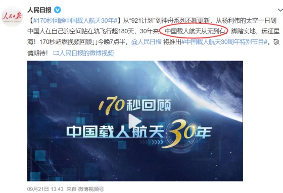 这段描述称“中国载人航天工程30岁”,将1992年9月21日中国立项实施载人航天工程,作为中国载人航天工程的起点。
