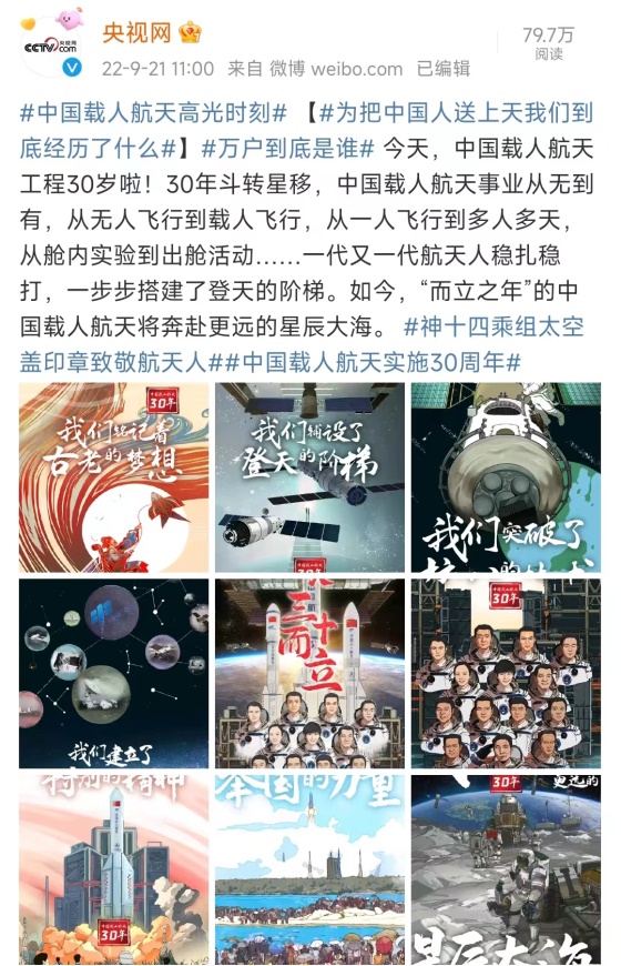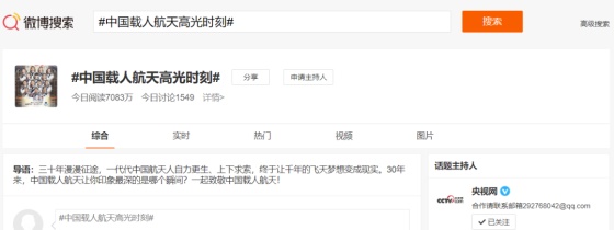 “中国载人航天高光时刻”的话题登上了微博热搜,话题主持人是央视网,笔者注意到央视网微博: