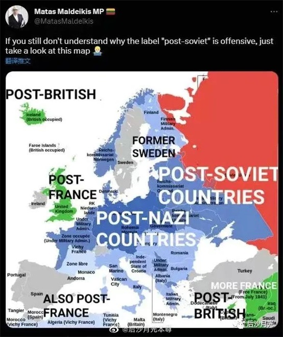 双方就在网上吵,昨天一位立陶宛网友怒了,他干脆在地图上把中东欧、西欧、意大利、巴尔干半岛都称作前纳粹国家,把北欧称作前瑞典国家,还把英国称为前法国(英国出自法国是欧洲一个老梗)……