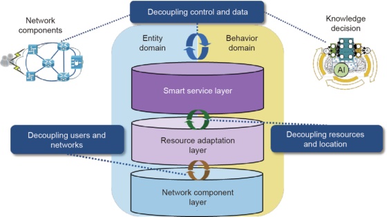 • 智慧服务层主要负责翻译用户意图和对服务注册功能进行管理。资源适配层动态调度网络资源,通过建立网络功能族群来满足智慧服务层的服务需求。网络组件层主要用于协调各网络组件,以执行特定的网络操作。