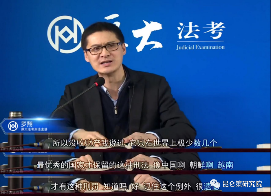 接下来罗翔解释为什么中国会有这种“奇特”的规定,“因为没收财产其实就是中国古代的抄家”。他还要特别强调,国家这项法律没收的是罪犯的“合法财产”。然后嘲讽一番只有“世界上极少数几个‘最优秀的国家’,例如中国、朝鲜、越南”,才有这种不尊重个人合法权利的处罚。