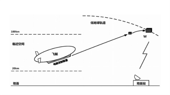 回归正题,所谓的“临近空间电磁发射卫星”是什么意思?简单来说,它其实是指安装有电磁弹射装置的飞艇,可通过电磁弹射技术将微纳卫星发射入轨,只不过,在发射之前,飞艇系统会率先抵达临近空间范围内运行,即20-100公里高的地方。