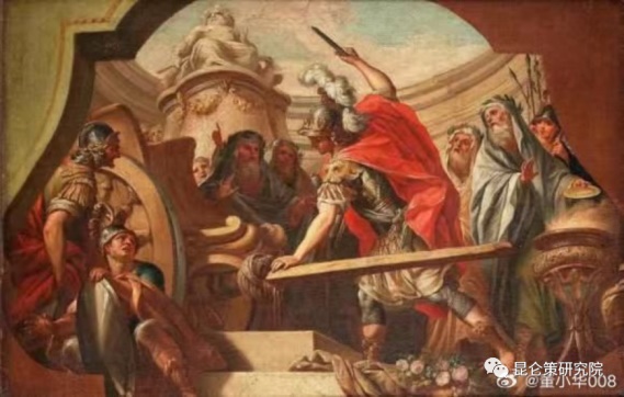 亚历山大指令手下几名将军去解开这个复杂的戈尔迪绳结,结果不仅没有解开,反倒绳结越来越紧。最后亚历山大大帝只好亲自出马来解绳结。他目不转睛地审视着绳结陷入沉思良久。突然他拔出佩剑,一剑把绳结劈做两段,所有的结都迎刃而解了。因此他成了当之无愧的亚细亚之王。