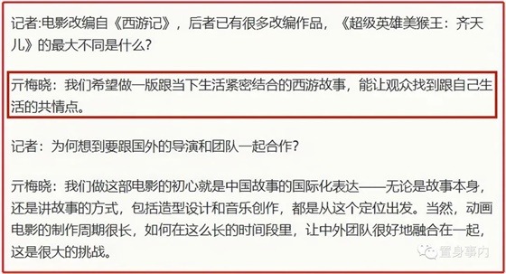 该片导演之一亓梅晓此前在接受采访时还表示,自己之所以找两位国外导演共同执导,初心是中国故事的国际化表达……希望做一部跟当下生活紧密结合的西游故事。