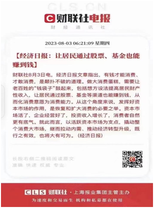 ----有钱才能消费、才敢消费,是颠扑不破的道理。做大消费蛋糕,需要让老百姓的“钱袋子”鼓起来,包括想方设法提高居民财产性收入,让居民通过股票、基金等渠道也能赚到钱,从而化消费意愿为消费能力。从这个角度来说,发挥好资本市场的作用,是恢复和扩大消费的必要之举(《经济日报》2023-08-03《促消费 资本市场大有可为 》)。