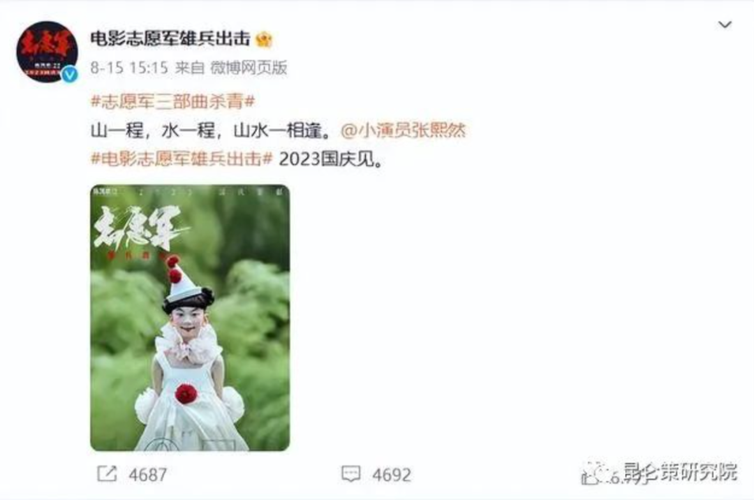 “八一五”当天,影片《志愿军·雄兵出击》推出了一款“小丑海报”。我第一时间就看到了,但却没有立即产生撰文批驳的冲动,原因主要在于,这款海报也有“优点”,即它没有欺骗性!制作并推出这款海报的人,对“最可爱的人”那种满满恶意、那种不加掩饰的不屑与轻蔑,都跃然纸上。这些年来,我只对揭露那些被巧妙伪装和深深隐藏起来的恶意感兴趣。比如《三体》就借章北海之口对抗美援朝做了一个完全否定性的评价,暗示我们读到的抗美援朝史都是谎言,但《三体》不是已经走上神坛了吗?章北海还被一些天真烂漫的网友附会为“教员”呢!