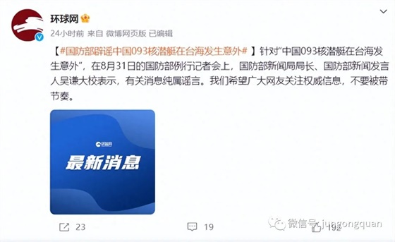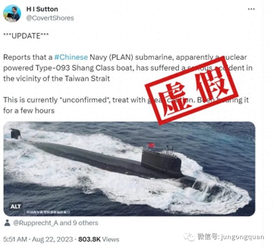 8月下旬,美国一名小有名气的“军事专家”萨顿,在社交媒体上煞有介事的宣称,“解放军台海演习发生重大事故,1艘093商级攻击核潜艇在台海海峡失事,艇上人员全部遇难”云云。这个谣言被一些反华人士和媒体转发,大肆渲染,消息也逐渐传到了国内网络上,引起了一些关注。