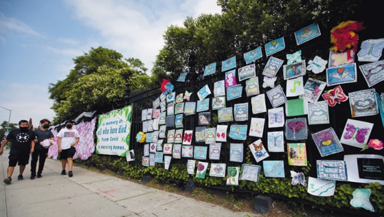行人从美国纽约一处墓地外为新冠死者设立的纪念装置旁走过(2021年6 月14日摄)王迎摄 / 本刊
