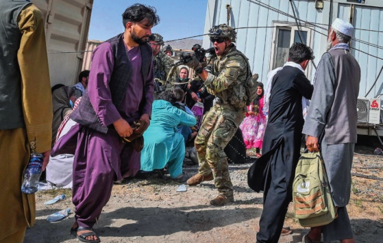 在阿富汗喀布尔机场,一名美军士兵用枪指向一名阿富汗男子(2021年8月16日摄)新华社 / 法新