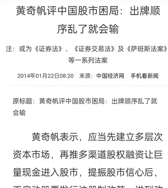 九年前,中国经济网的一篇文章《黄奇帆评中国股市困局,出牌顺序乱了就会输》中黄奇帆曾警告我们,注册制可能会引发巨大问题。