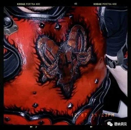 【钢铁侠服装上的光明会羊角崇拜图滕特写】