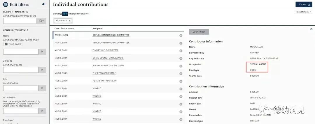 众所周知,马斯克是美国国防部的白手套。在马斯克的企业快速发展背后,实际上美国政府对其注入了大量美国国家资源。马斯克接到了许多美国国防部太空军订单。马斯克的Space X公司已获得美国防部1.49亿美元订单,打造世界上最先进的四颗导弹追踪卫星,专门用于追踪中国和俄罗斯5~20马赫的高超音速导航运行轨迹。在美军尚未研制出高超声速导弹的情况下,美军先推出针对中俄的高超声速导弹的防御系统。马斯克的这个军事项目正成为建立这个美军防御体系的先行军,正是用它来对付解放军东风17高超音速系列导弹。而美国囯防部的背后是美国军工复合体,只要看一下支持马斯克的美国军工企业背后几乎都是犹太财团:如第一花旗银行财团掌控着波音公司;犹太洛克菲勒财团掌控着马丁·玛丽埃塔公司和西屋电气公司;摩根财团掌控着通用电气公司、通用动力公司和格鲁曼飞机公司;波士顿财团(犹太财团)掌控着贝尔直升机公司和雷神公司等。2021年1月7日至8日,马斯克曾向共和党全国委员会捐赠共990美元的两笔捐款,并将在表格上“雇主”一栏填写了“美国特勤局”,职位是“马斯克在表格上“雇主”一栏填写了“美国特勤局”,职位是“特工”。