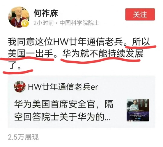 何院士言论轻浮还表现在,他曾说美国一出手,华为就不能持续发展。然而当华为在芯片方面的研究取得重大突破,要冲破美国霸权制裁的包围圈时,何院士表面看像是祝贺,但言语间充满了阴阳怪气。