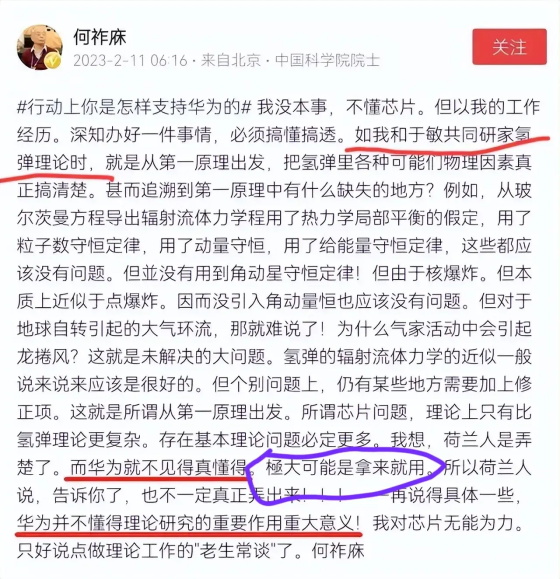 为什么我此前说何院士的言论很轻浮呢?轻浮,在他的这句话就体现得淋漓尽致。华为全称是华为技术有限公司,他不是一个专门搞芯片理论研究的机构,也不是光刻机的生产企业,甚至都不是芯片的生产企业,所以华为即便不懂芯片的基础理论也很正常,因为他本来就不是专门搞这个的。但你要说华为不懂理论研究的重要性,那就是纯粹的凭空臆测。