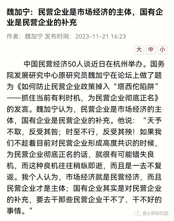 魏加宁11月21日“市场经济就是民营经济,而且民营企业才是主体,国有企业其实是对民营企业的补充”的发言触及到了宪法的最基本特征和共产党的执政基础。体制内高层智囊的身份,在一个规模很大,规格很高的场合涉及当前中国的重大政治问题,也是重大理论是非的发言,理所当然地引起了人们对宪法原则的担忧。任何一个中国经济几十年近距离的观察者,听到这种披着经济外皮的政治宣言都不感到意外,这种“宪政社会主义”,“宪政民主”和“社会转型”,10年前我们听得实在太多了。去年不是还有人在论坛上高喊,“国有企业的存在就是问题”,“把国企做强做优做大的提法,本身就是错的”。关键是时机,中美之间的贸易战,科技战,金融战正在愈演愈烈,这个时间节点上的任何动作都离不开这个背景,都有比表面话语更深刻的政治含义。中国正在被美国被动地拉入新冷战,在这个新旧交替的“换档期”,中国面临着从美国控制的意识形态中突围,构建新的话语体系,还是回到美国指定的位置上去。这是一个重要的时刻。就在魏加宁论坛发言的几乎同时,他的恩师吴敬琏获得了2023网易年度最具影响力经济学家奖。随后吴敬琏一篇11年前“中国经济社会矛盾几乎到了临界点”的文章突然在网络上疯传。曾经的厉以宁和吴敬琏论战了好多年,但是他们在解体国企上是高度一致的。都是死活不承认市场经济、私有制、资本剥削会带来两极分化,都是赤裸裸地代表资本家阶级的利益。魏加宁比吴敬琏厉以宁更为激进,他认为如果问题不解决,就会引发“社会动荡,农民起义”,这是要振臂一呼吗。12月14日,美国财长耶伦呼吁中国转变经济政策。她说,国有企业作用过大会限制增长,安全机构作用过大会阻碍投资。一切都不是巧合。就在美西方频频唱衰中国经济,穆迪调整了中国主权信用的评级,美国同中国“脱钩断链”的关键时刻,在信心比黄金更可贵的时候,有一股力量出手了。无论任何国家,最大的社会契约就是宪法。这个世界上最毒的心灵鸡汤,就是把公有制和市场经济完全对立起来,把颠覆国家宪法叫作改革。当有人不再回避核心观点的碰撞,不再隐瞒一场政治交锋的时候,决战已经不可避免。突破宪法和党的领导,一直是中国新自由主义的坚定信仰。当年参与很多“顶层设计”的老公知徐景安就自豪地讲过,“我国国企改革从内容到形式都是违宪的”,“中国改革一直都是违宪、护宪、修宪的斗争”。人民当家作主和公有制的宪法一直是他们改革的终极目标。近十年来,他们消停了很多,但是一直没有得到反思和清算。他们从来不甘心自己的失败,一直在寻找上场的时机。今天看来,他们认为时候到了。中国新自由主义就是美国的代理人,正是因为这些人的存在,使美国围剿中国的成本并不高,但收益极大。中国同他们之间的斗争,是中美博弈的另一个战场,本质上是对抗性的敌我矛盾。中国最大的危险就是内部的买办和亲美势力,它们最大的危害就是把中国变成了一个“在精神和文化上被美国占领的国家”。这些新自由主义信徒此前是中国经济的祸根,现在是中国最大的潜在危险。他们全面私有化最大的障碍就是宪法和中国的领导体制。他们要“杀出一条血路”,坚定不移地认为资本主义才是最好的社会制度,买办经济和效率优先才是中国的唯一出路。