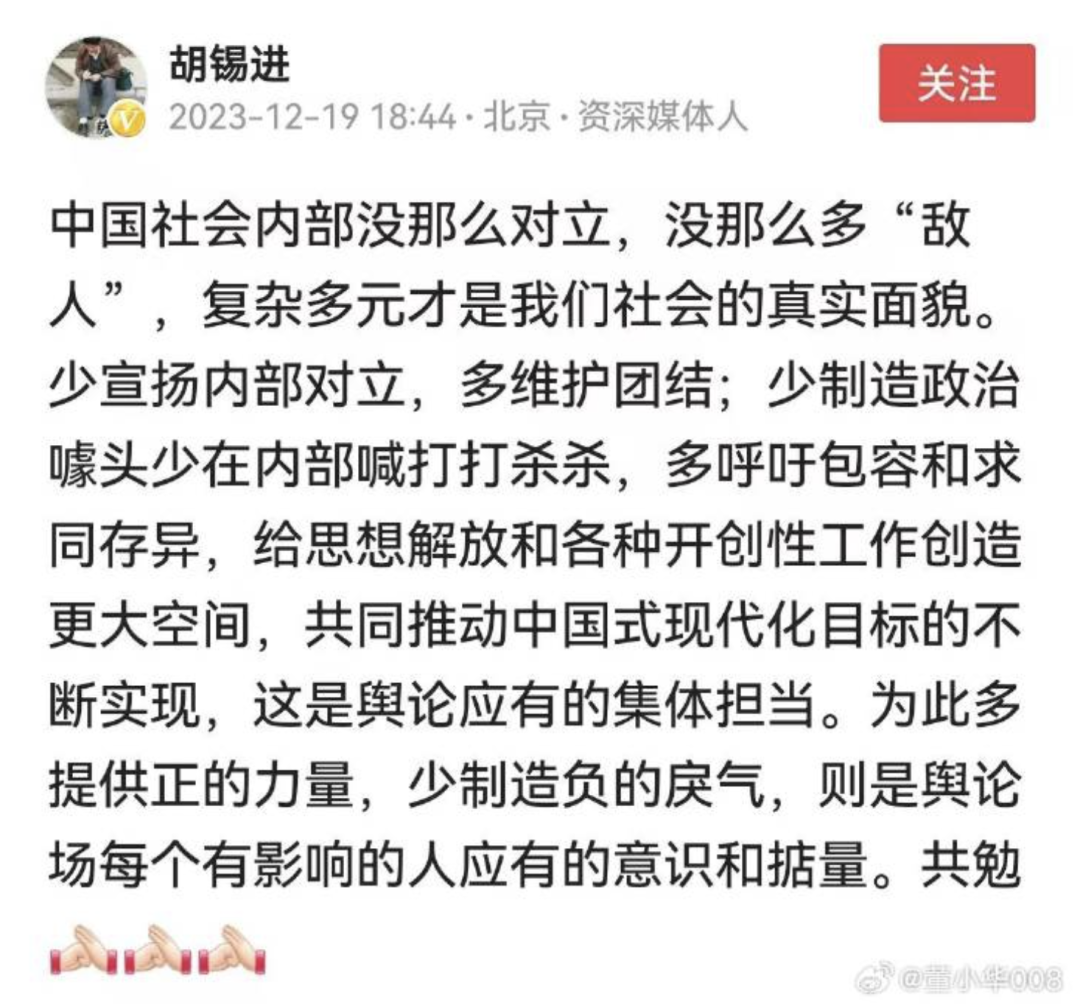 胡锡进回应网友们对他的质疑来了,胡锡进说:“中国社会内部没那么对立,没那么多敌人,复杂多元才是我们社会的真实面貌。少宣扬内部对立,多维护团结;少制造政治噱头少在内部喊打打杀杀,多呼吁包容和求同存异,给思想解放和各种开创性工作创造更大空间,共同推动中国式现代化目标的不断实现,这是舆论应有的集体担当。为此多提供正的力量,少制造负的戾气,则是舆论场每个有影响的人应有的意识和掂量。共勉”看过胡锡进的这个帖子,我想到了两个名词,那就是“掩耳盗铃”和“驼鸟政策”。掩耳盗铃就是偷铃铛时,铃铛叮叮当当山响,偷铃铛的人把自己的耳朵捂上,以为自己听不到了,就等于铃没有响。而“驼鸟政策”是指猎人追捕驼鸟,愚蠢的驼鸟把自己的头插进沙子里,自以为看不到猎人,猎人就不存在了。胡锡进何尝不是如此,判断他的这番言论能否成立,关键在于他说的话,是建立事实的基础之上的判断,还是建立在掩盖事实基础之上的判断,如果是建立在掩盖事实的基础之上做出的定论,不排除胡锡进在混淆视听。下面继续判定一个事实:司马南口中的“反贼”,现实中存不存在?开国大将黄克诚在《回忆录》回忆盐阜区反“扫荡”斗争时,描述当时战局的情况,日寇集中十七师团,三十五师团,十五师团独立十二混成旅团各一部共约万余人,集中伪军徐继泰、李实甫、潘干臣、刘湘图、胡冠军、朱保元等部及地方伪军共约八九千人,于1943年2月初抽调集中,2月中旬向盐阜区我军及友军"扫荡"。从黄克诚将军的回忆中,可见当时伪军势力之盛!现在有一问,现今的汉奸势力对比抗日战争时期如何?答案是无法统计。然而通过判断价值取向的斗争的现状,可以进行粗略的估计。鉴于思想领域已不是铁板一块,舆论阵地相继失守的惨烈程度和负面言论登堂入室的事实,结合美日不惜重金在中国收买喉舌的计划在中国实施,通过现象看本质,可以做出当前的汉奸势力并不比抗日战争少的这个结论。胡锡进的“中国社会内部没那么对立,没那么多敌人”,的结论是不成立的,更像是试图掩盖事实的烟雾弹。而胡锡进的“复杂多元才是我们社会的真实面貌。”的判断,还是相对准确的。胡锡进的这两个判断相互自相矛盾,也可透射出中国改革开放的崛起之路并不是平坦如砥的。今年七月,著名的阿彭斯论坛在美国科罗拉多州举行,美国中央情报局局长伯恩斯的一番言论引起各国媒体的高度关注。7月20日,伯恩斯在论坛上透露:“近几年来,美国中情局在“重建”对华情报战能力方面所取得了巨大进展。美中情局在中国安插了大规模的内线,而且成效显著。”