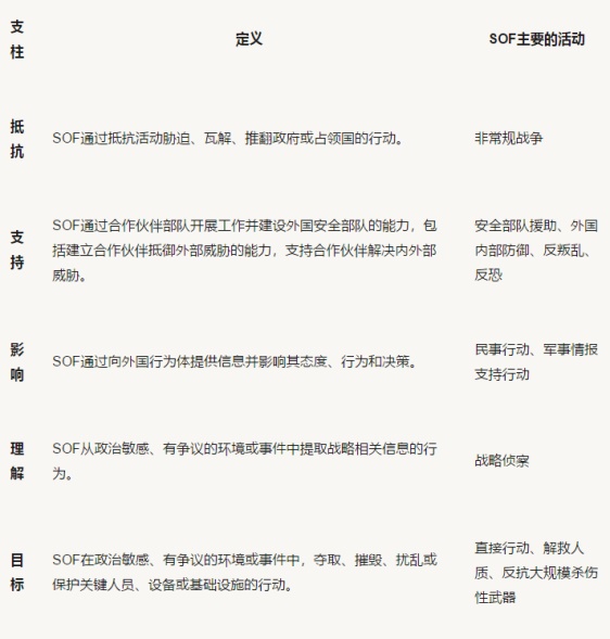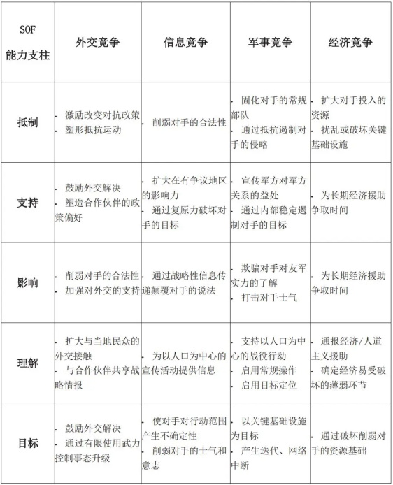 SOF在战略干扰中的价值主张,即通过五个独特的能力支柱(抵抗、支持、影响、理解和目标)挫败对手首选战略的能力,从而创造时间、空间和机会,以实现跨越国家重要领域的战略目标,具体来说战略干扰中SOF具有以下五大能力支柱: