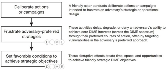 这些活动通常针对对手首选战略中的漏洞,延迟、削弱或阻碍对手通过其首选战略实现核心DIME利益(跨越DIME范围)的能力。