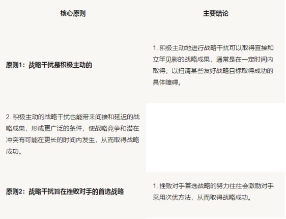 战略干扰(Strategic Disruption)是指主动出击来故意拖延、削弱或阻碍对手通过其首选战略实现核心利益的能力,为实现国家目标创造有利条件。具体而言,实施战略干扰需符合以下三大原则: