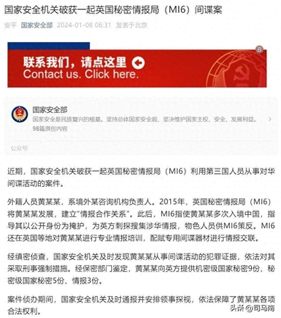 今天跟大家说一个刚刚发生的事儿,咱们国家破获了一起英国秘密情报局的间谍案。