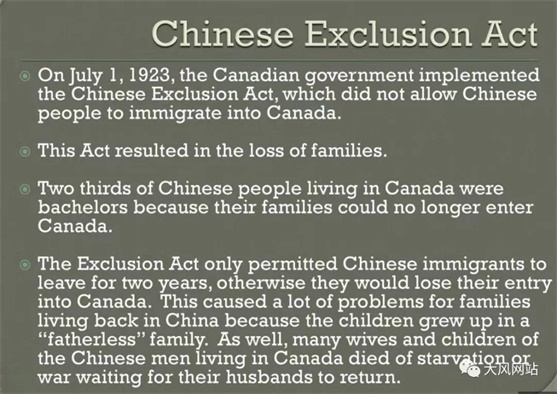 加拿大1923年排华法案简介:三分之二居住在加拿大的华人都是单身,因为排华法案之后,华人的家人不准进入加拿大。