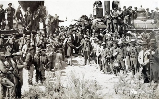 美国修建太平洋铁路的劳工中,90%以上是华工。1869年打下最后一根道钉、铁路通车典礼上,老板、经理、工人集体拍照,纪念这个历史时刻,但不准华工出现。