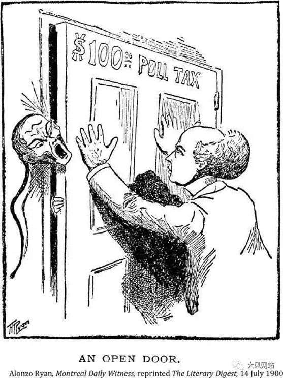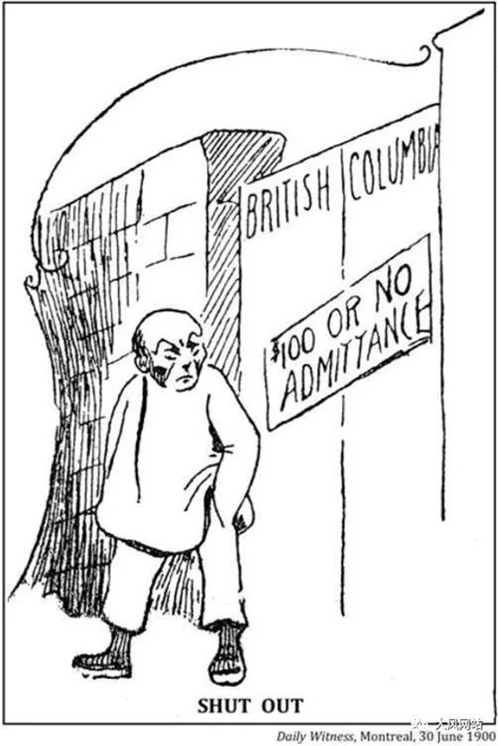 1900年的漫画:“门户开放政策:交不起100块钱人头税的中国佬,不许进入加拿大!”