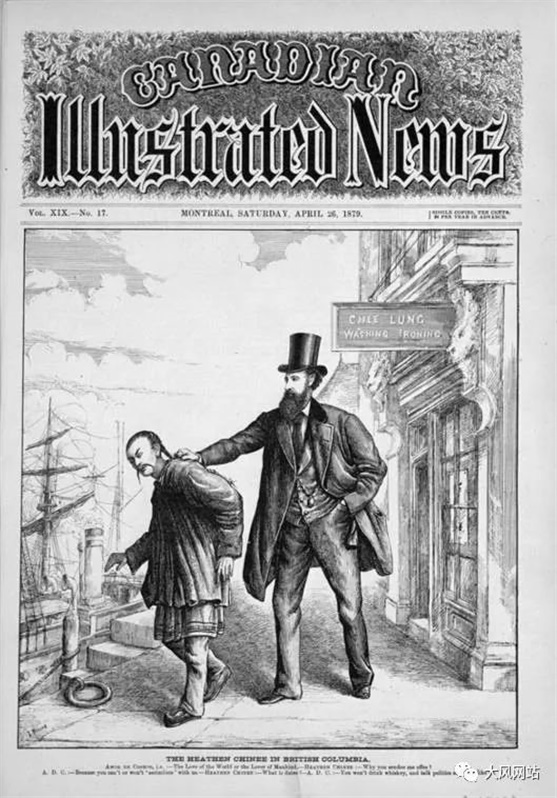 1879年4月26日蒙特利尔《加拿大新闻》头版漫画:“卑诗省的异教徒中国佬”,白人将华人从洗衣店中揪岀来,赶下太平洋。