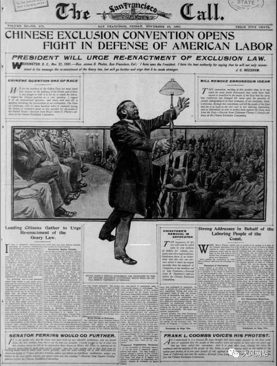 1892年7月23日旧金山市内的集会通知:“周一晚7:30分,请到第十街和A街口,表达你对华人问题的观点:我们要华人吗?不要!不要!不要!”(“华人问题”:太平洋铁路公司为了省钱,雇佣大量华工,付给低于白人的工资。白人劳工和全社会视华工为“黄祸”,到处集会暴力排斥“中国苦力”。)