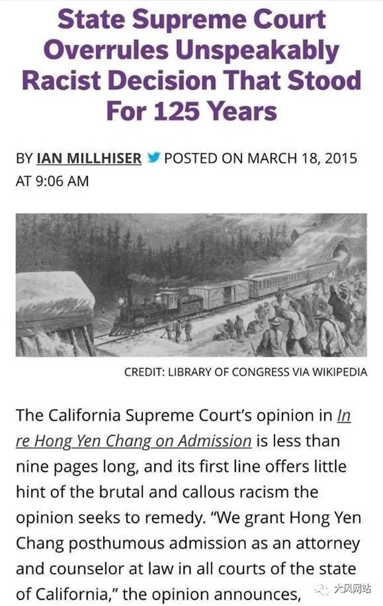 美国反对种族歧视的《民权法案》生效已经快60年了,2014年加州法院已经批准一位墨西哥非法移民的加州律师执照,但针对张律师这个纯粹种族歧视华人的判决,居然能在加州维持125年,直到加州的华裔律师、法学院教授和许多华裔群起抗议,才得以改判。