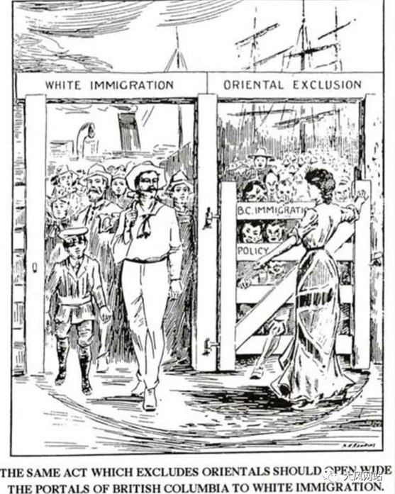 漫画:排华法案严禁东方人进入加拿大,卑诗省敞开大门欢迎白人移民。
